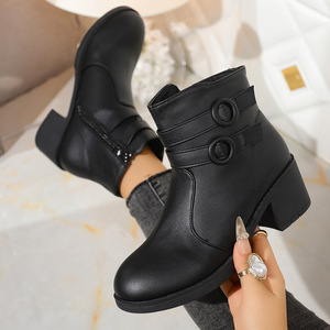 2025跨境大码欧美秋冬新款英伦风马丁靴女皮带扣粗跟短靴外贸批发