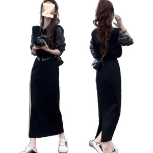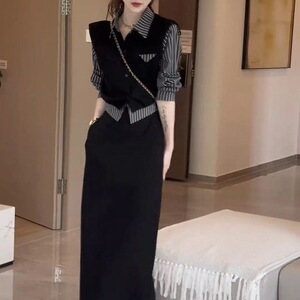 春春秋夏穿搭一整套高级感修身两件套时尚条纹假两件衬衫半身裙套
