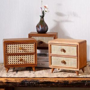 桌面杂物收纳储物盒抽屉式复古多层桌面置物架日式藤编收纳柜