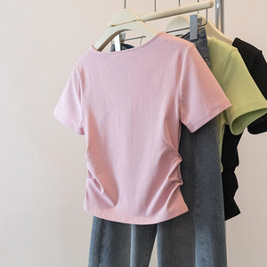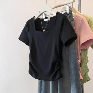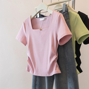 夏季微胖mm大码女装方领短袖t恤收腰遮肚显瘦上衣