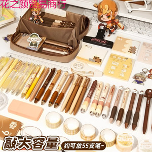 【学習セット】コーヒー色ペンケース+西遊記シール5枚+PPクリップ+ペンダント+筆ペン5本+付箋+蛍光ペン4本+定規4点セット+修正テープ6本