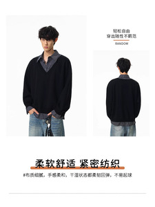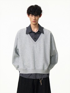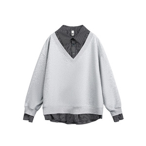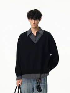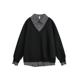 原创美式复古假两件拼接条纹衬衫卫衣男士宽松休闲百搭情侣款上衣