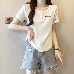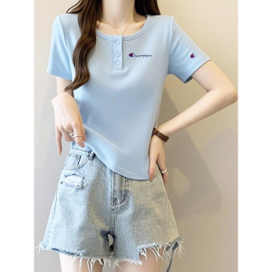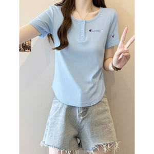チャンピオンキャプテン刺繍純綿薄手年齢軽減半袖Tシャツ2025夏スリムフィットラウンドネックトップ女性バージョン