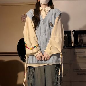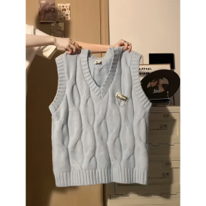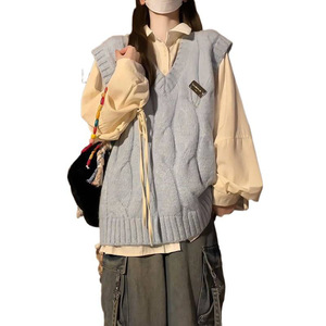 秋季套装衬衫绑带麻花杏色单件日系毛衣女甜美针织马甲背心蓝色