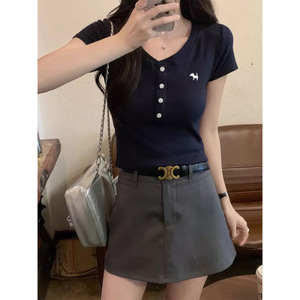 藏青色正肩V领棉质短袖T恤女夏内搭打底衫修身简约百搭体恤上衣潮