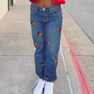 海外貿易人気商品、在庫ありの婦人服メーカー、越境在庫発送、欧米向け細身ワイドパンツ、ハート柄デニム、女性用TEMU
