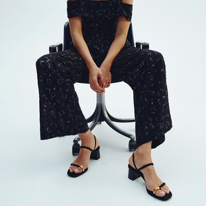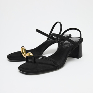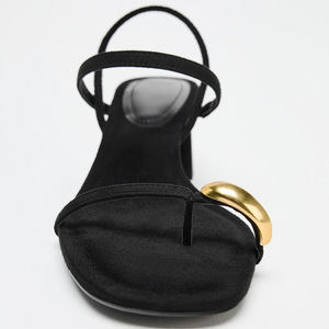 ZA2025夏季新款方头粗跟金属夹趾凉鞋时尚简约一字扣带露趾凉拖鞋