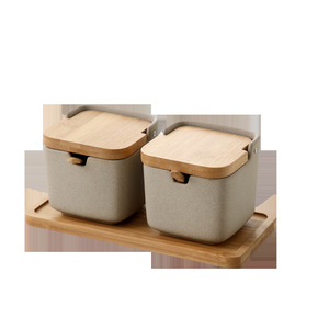厂家日式创意简约竹盖养身陶调味罐厨房调味调料盒3件糖盐罐三件
