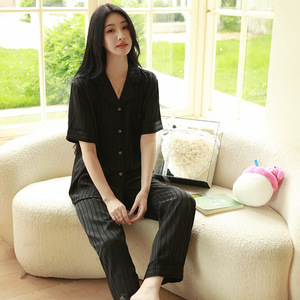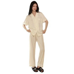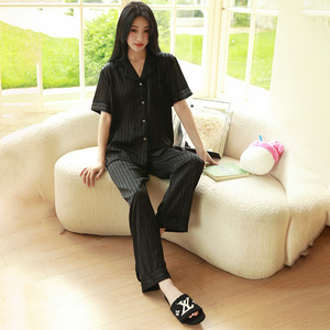 2025新款冰雪丝睡衣女缕纹花边短袖长裤开衫宽松休闲风家居服套装