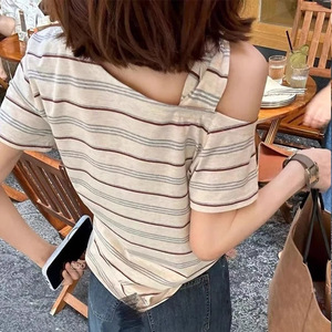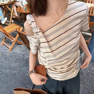 韩系小清新别致条纹吊带斜肩上衣女夏2025新款设计感小众短袖t恤