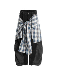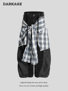 美式复古假两件可拆卸衬衫屁帘拼接牛仔裤男女宽松阔腿直筒长裤