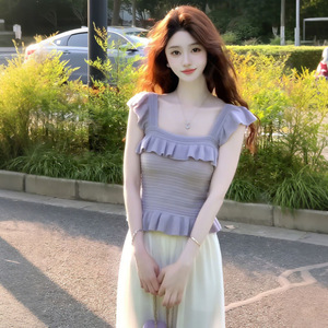 レッドフリルスクエアカラースモールフライングスリーブニットベスト女性の夏の美しいピンチウエスト痩身トップ女性の服