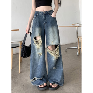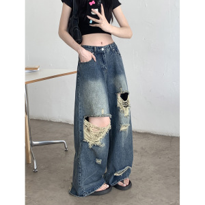 150小矮个子美式破洞牛仔裤女夏季高腰直筒拖地裤辣妹复古阔腿裤