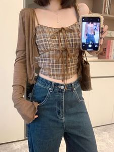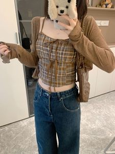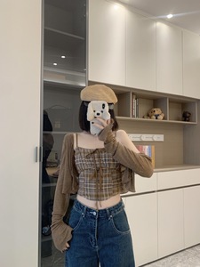 大码早秋甜辣妹复古设计防晒短款小开衫+格子吊带上衣两件套