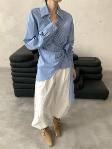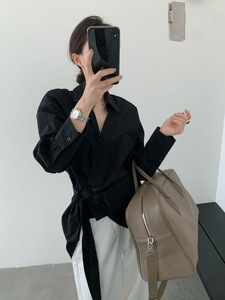 THINK十三行韩系设计感系带不规则衬衫女2025秋季新款V领宽松上衣