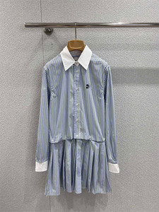 2025夏季新款南油miu甜美学院风褶皱条纹可拆卸翻领衬衫式连衣裙