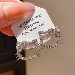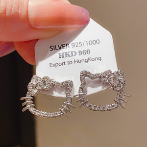 银针轻奢镶钻KT小猫耳钉卡通创意小众个性耳环独特高级感精致耳饰