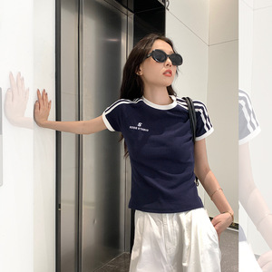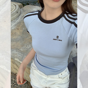 宋正恩条纹正肩短袖t恤女夏装设计感辣妹修身显瘦白色体恤短上衣