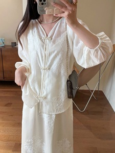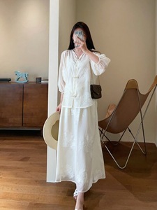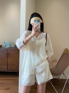 新中式国风轻薄透气天丝订珠盛扣上衣松紧腰短裤A字裙套装G072501