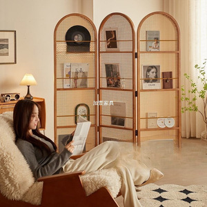 北欧风藤编屏风隔断艺术置物架电镀木可移动延长客厅空间