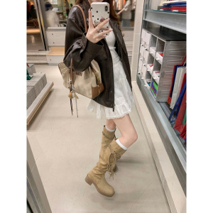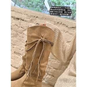 【双筒围】埃及靴流苏粗跟中高筒长靴西部牛仔靴女堆堆靴加宽加肥