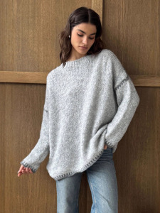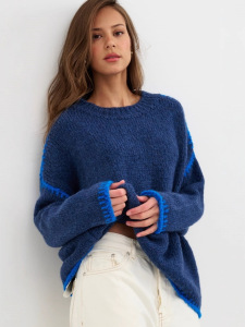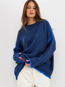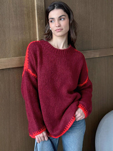 跨境外贸秋冬新款休闲宽松粗针反骨绣撞色套头衫圆领长袖加大毛衣