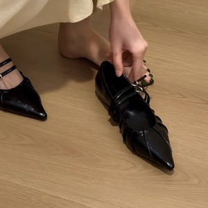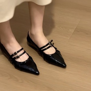 法式褶皱尖头玛丽珍鞋女一字扣带复古黑色内增高气质瓢鞋