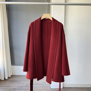山羊绒天丝羊毛翻领系带收腰双面毛呢大衣 小个子外套秋冬G072503