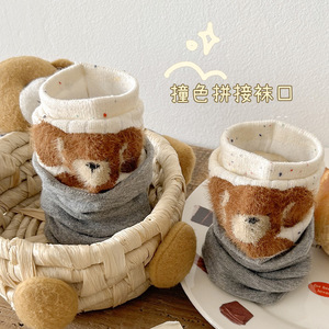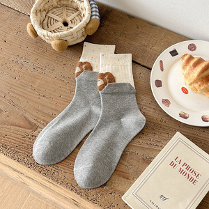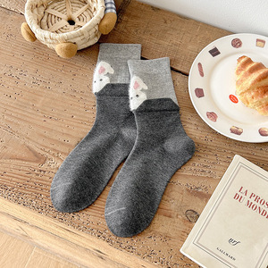 植绒卡通动物袜子女秋季新款韩版中筒袜拼接假两件堆堆袜灰色袜子