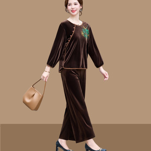 新款中老年女装两件套妈妈秋装时尚金丝绒套装宽松中国风