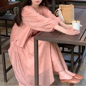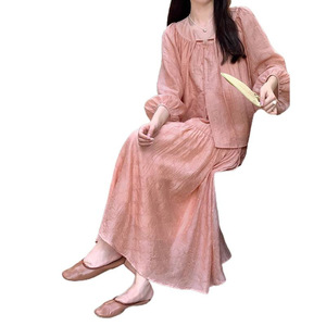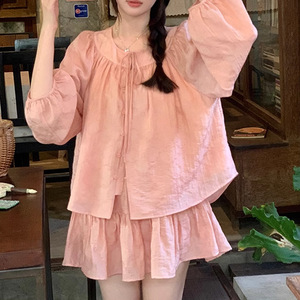 新中式粉色宽松圆领防晒衬衫女夏小个子天丝长袖上衣短裙长裙套装