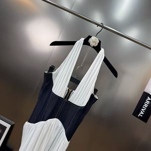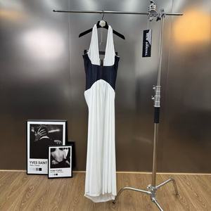 2025年夏季显瘦拼接色挂脖深V露背开叉法式优雅气质连衣裙