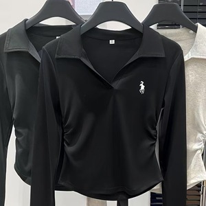 POLO衫刺绣长袖打底衫女秋冬新款设计感小众修身显瘦正肩上衣