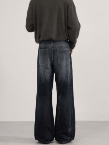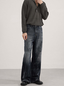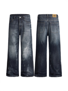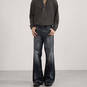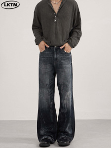 LKTM男装 美式cleanfit重工水洗扎染牛仔裤男女潮牌竹节纹微喇裤
