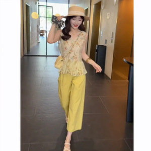 套装夏女2025新款洋气减龄碎花V领上衣气质百搭高腰休闲裤两件套