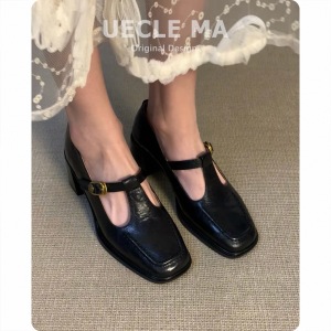 牛皮版~复古玛丽珍鞋中高跟不累脚粗跟法式单鞋女绝美方头小皮鞋