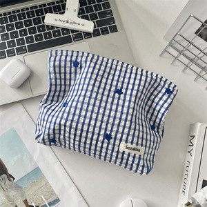 57192 格纹蓝色系刺绣小花化妆包女口红收纳包气垫补妆袋收纳袋