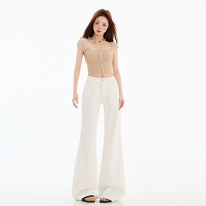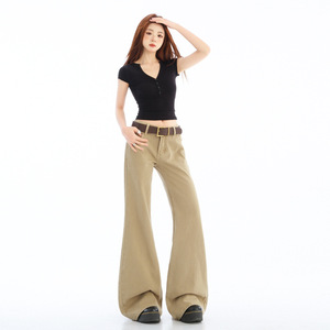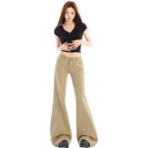 尚雅5579款卡其色微喇不贴腿牛仔裤女美式复古低腰窄版显瘦长裤
