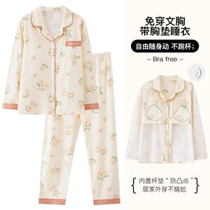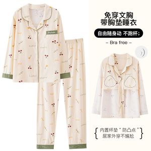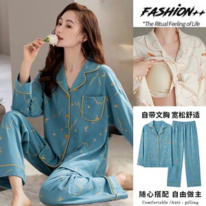 5A抗菌带胸垫睡衣女纯棉春秋季长袖大码女士开衫套装免穿文胸家居