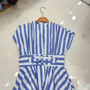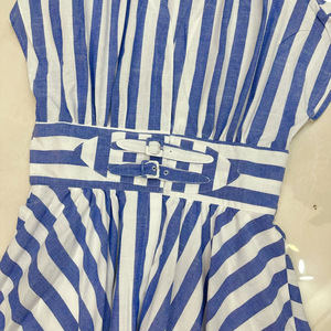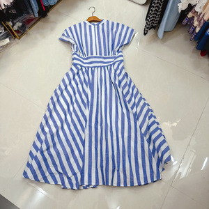 十三行澳洲法式小众收腰腰封竖条纹无袖亚麻大摆裙连衣裙A2#8175