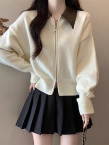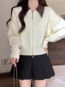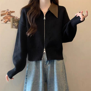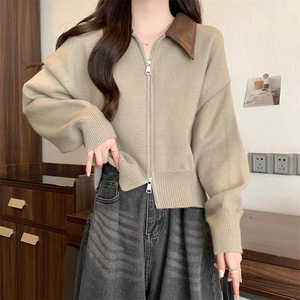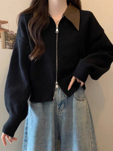 2025秋冬新款双拉链拼接POLO领针织开衫女宽松休闲慵懒风毛衣外套