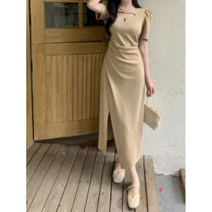 杏色连衣裙【设计感小众/冷淡系/感/巨显瘦遮肚子/遮肉/复古/修身/别致超好看/藏肉/小个子/垂坠感