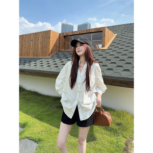 韩系气质凹造型的白衬衫翻领泡泡袖收腰衬衣上衣女