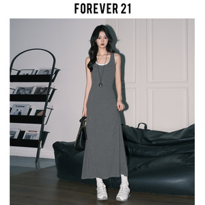 Forever 21气质休闲假两件A字连衣裙女黑色U领拼接包臀背心长裙子