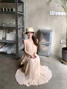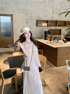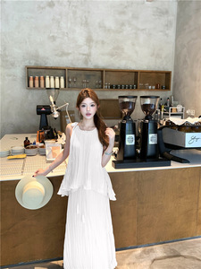 韩系绝美小套装系带挂脖上衣压褶无袖衬衫设计感高腰百褶半身长裙