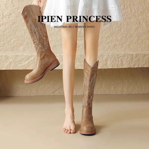 厚底增高刺绣旅游高筒骑士靴2025秋季新款长筒靴棕色西部牛仔靴女