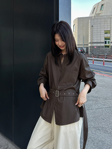 Harper高级感翻领皮衬衫女十三行秋季新款宽松百搭绑带长袖上衣
