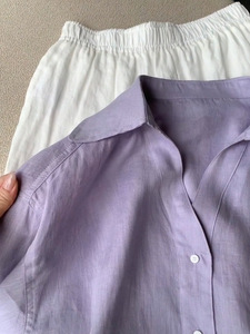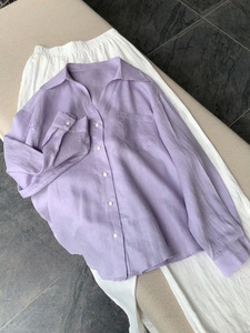 CHAO级推荐!浅紫色V领亚麻衬衫女夏季新款polo领宽松防晒衫上衣
