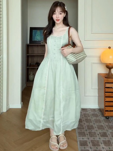 法式绿色背心连衣裙女2025夏季新款高级感度假修身收腰无袖长裙子