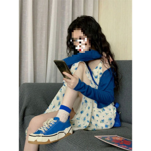 小个子法式蓝色碎花吊带连衣裙子女夏季2025新款海边度假长裙套装